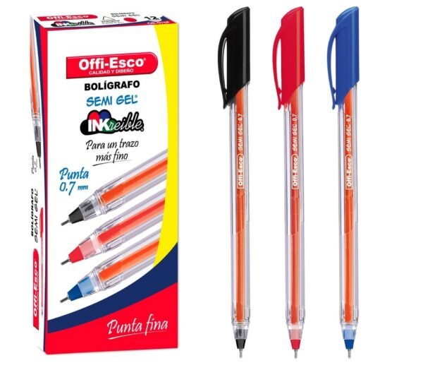Lapicero offiesco con tapa punta delgada de 0.7mm, tinta semi gel, cuerpo triangular y distintos colores.